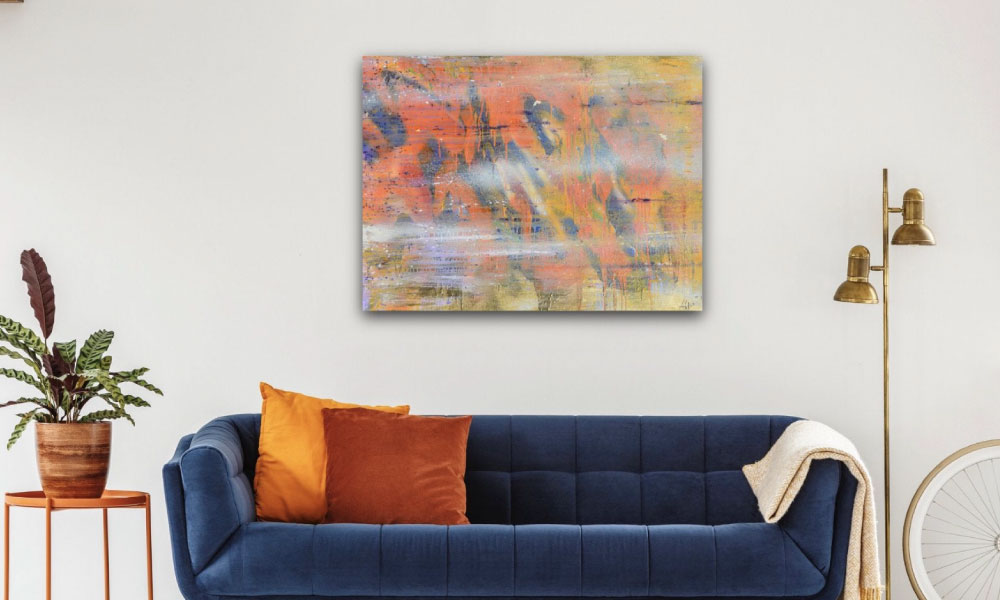 Artwork Description: An undertone of dark blue grounds this painting in serenity, overlaid with vibrant orange, spontaneous yellow and the abundant energies of gold, all seen through a haze of light giving this piece a fog like feeling.