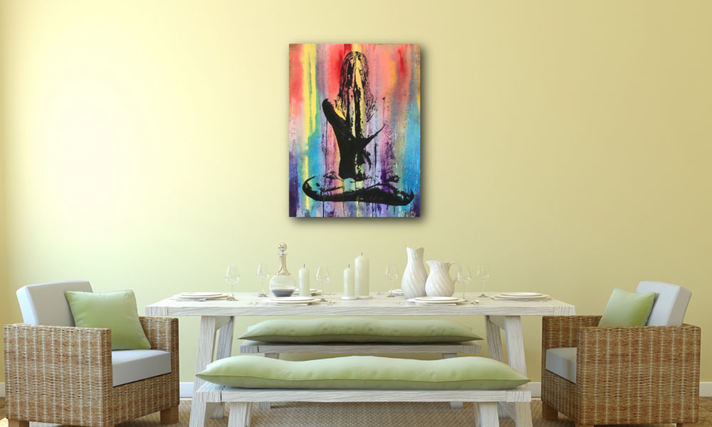 Using the lively energies of red and yellow, in contrast with calming blue and purple, this work reflects joyful spontaneity coupled with peaceful spiritual centeredness to highlight an overall sense of duality.